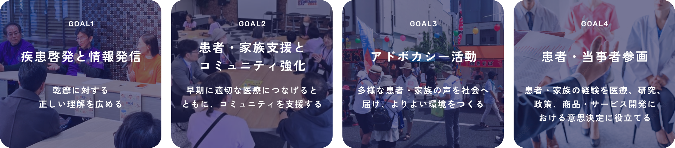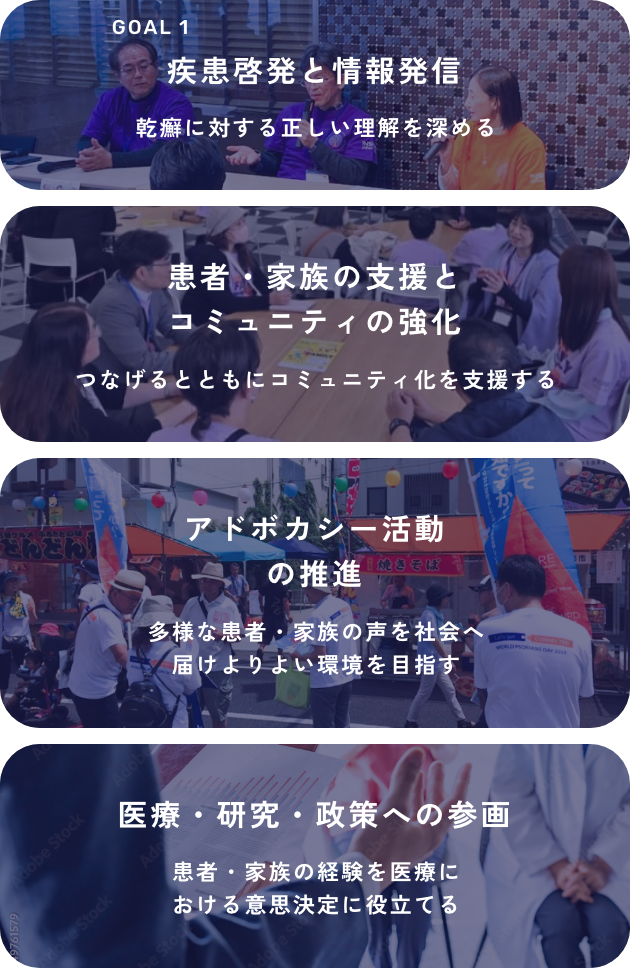 患者・家族の声を社会に届け、医療者、政策立案者、企業などと協働・共創しながら、乾癬患者・家族を取り巻く環境をより良いものへと変えていきます。