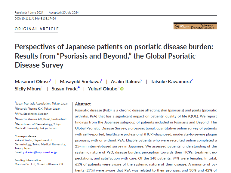 IFPA(International Federation of Psoriasis Associations)とノバルティス社が共同で実施した国際調査研究「Psoriasis and Beyond」における日本人サブグループデータが、2024年9月、当協会の奥瀬正紀を筆頭著者、添川雅之を共著者とする論文として公表されました。
